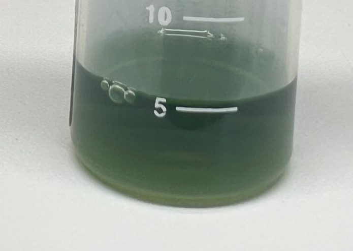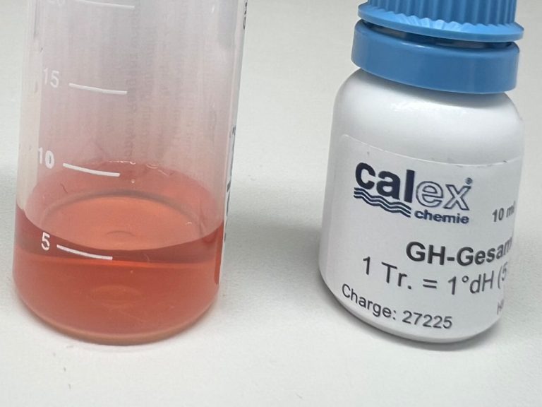 Die Flüssigkeit der Tropfflasche wird dem Wasser beigemengt. Der Indikator färbt das Wasser rot.